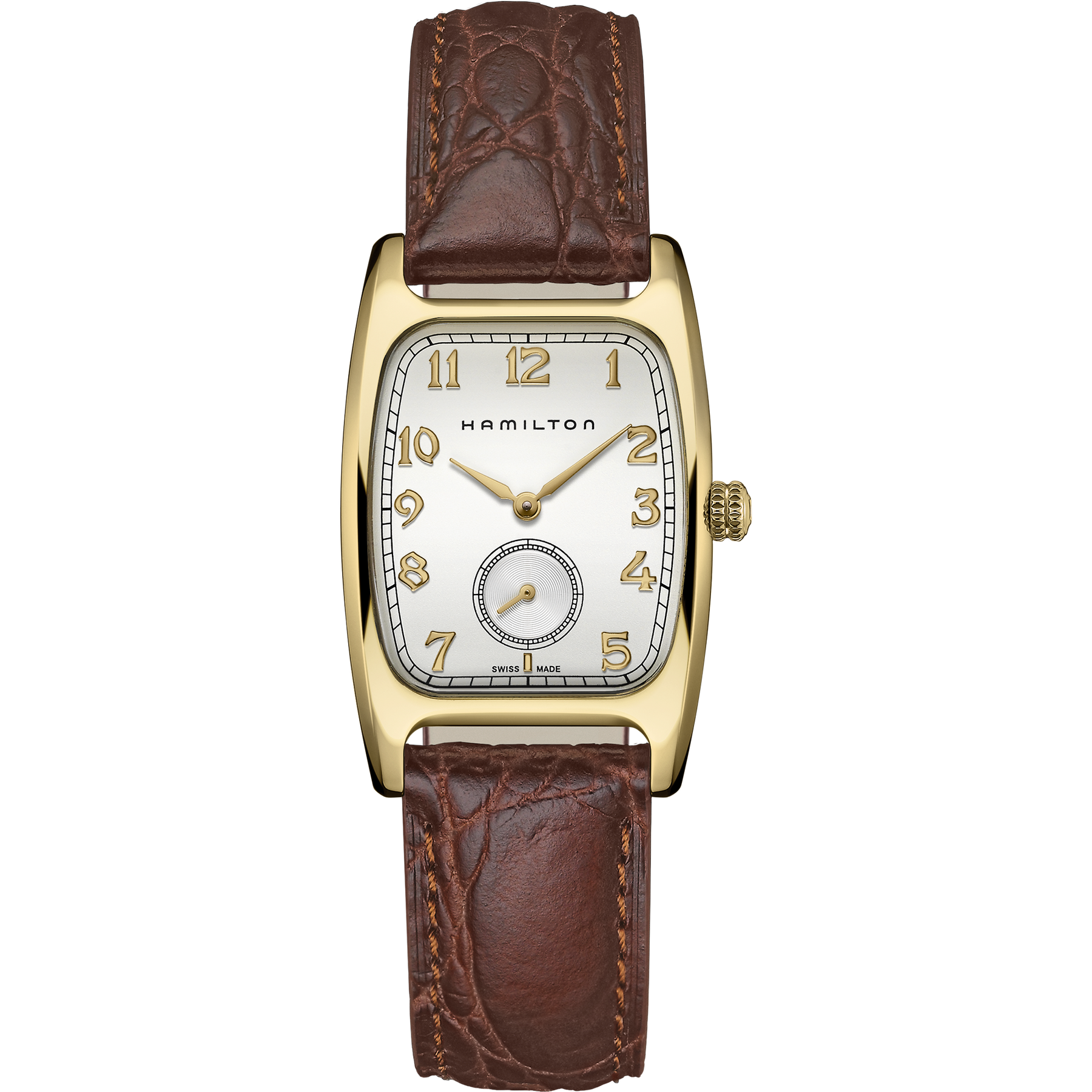 The Hamilton American Classic Boulton Quartz is a refined timepiece inspired by the original 1941 design. Featuring a rectangular stainless steel case with yellow PVD coating and a classic white dial, it blends vintage character with modern proportions. Powered by a precise Swiss quartz movement, it offers reliable everyday performance. Finished with a brown grained calf leather strap and 30m water resistance, this elegant model stays true to Hamilton’s American heritage. Featured in Indiana Jones and the Dial of Destiny (2023) and Superman: Legacy (2025).
