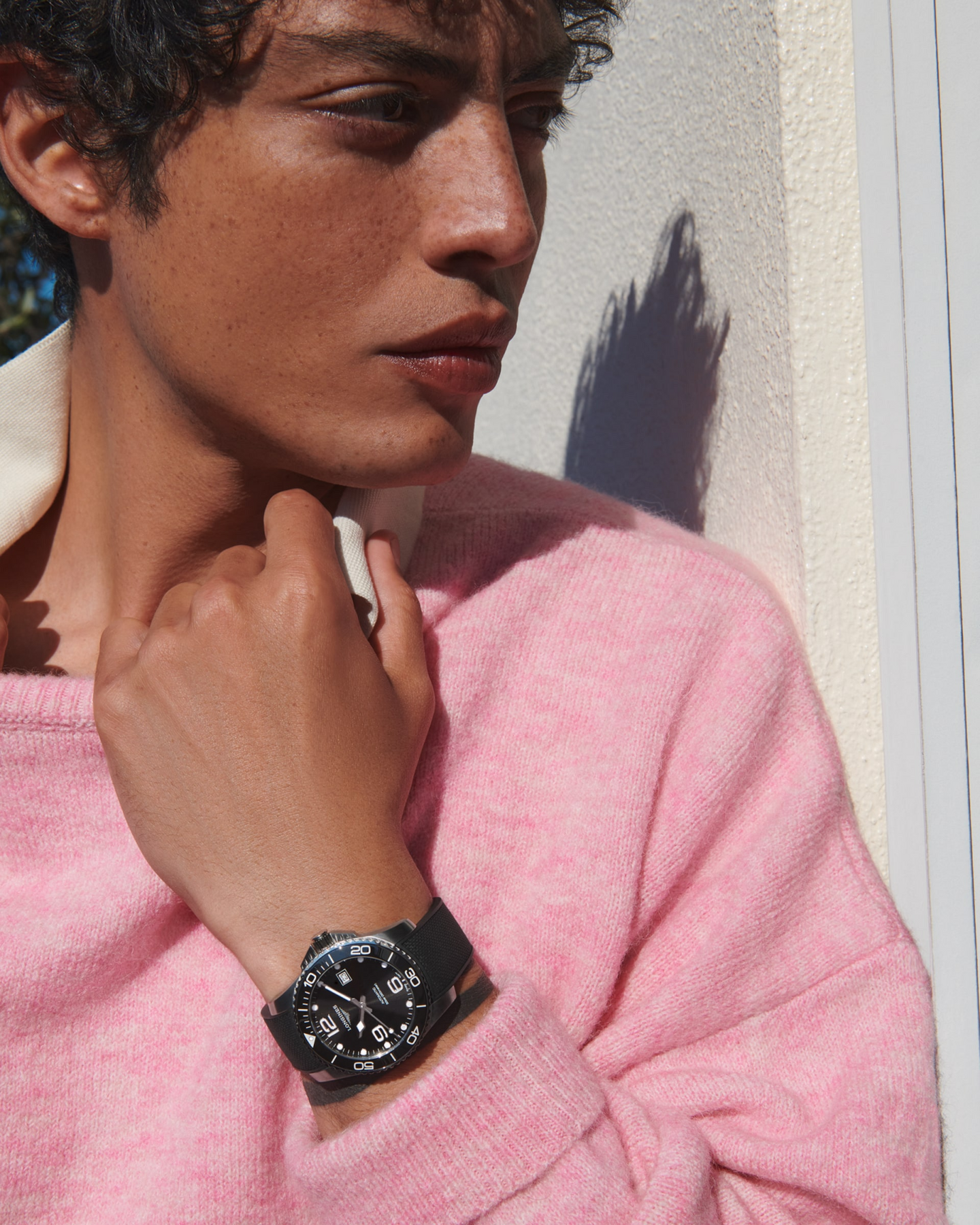 The Longines HydroConquest 41mm combines sporty performance with refined design. Powered by a self-winding mechanical movement (Caliber L888) beating at 25,200 vibrations per hour, it delivers up to 72 hours of power reserve. The sunray black dial with applied Arabic numerals and indexes features silvered polished hands enhanced with Swiss Super-LumiNova® for superior legibility in low light conditions. Encased in stainless steel with a ceramic unidirectional rotating bezel and screw-in crown, this professional diving watch is water-resistant to 30 bar. It is paired with a black rubber strap secured by a double safety folding clasp with push-piece opening mechanism. Swiss Made.