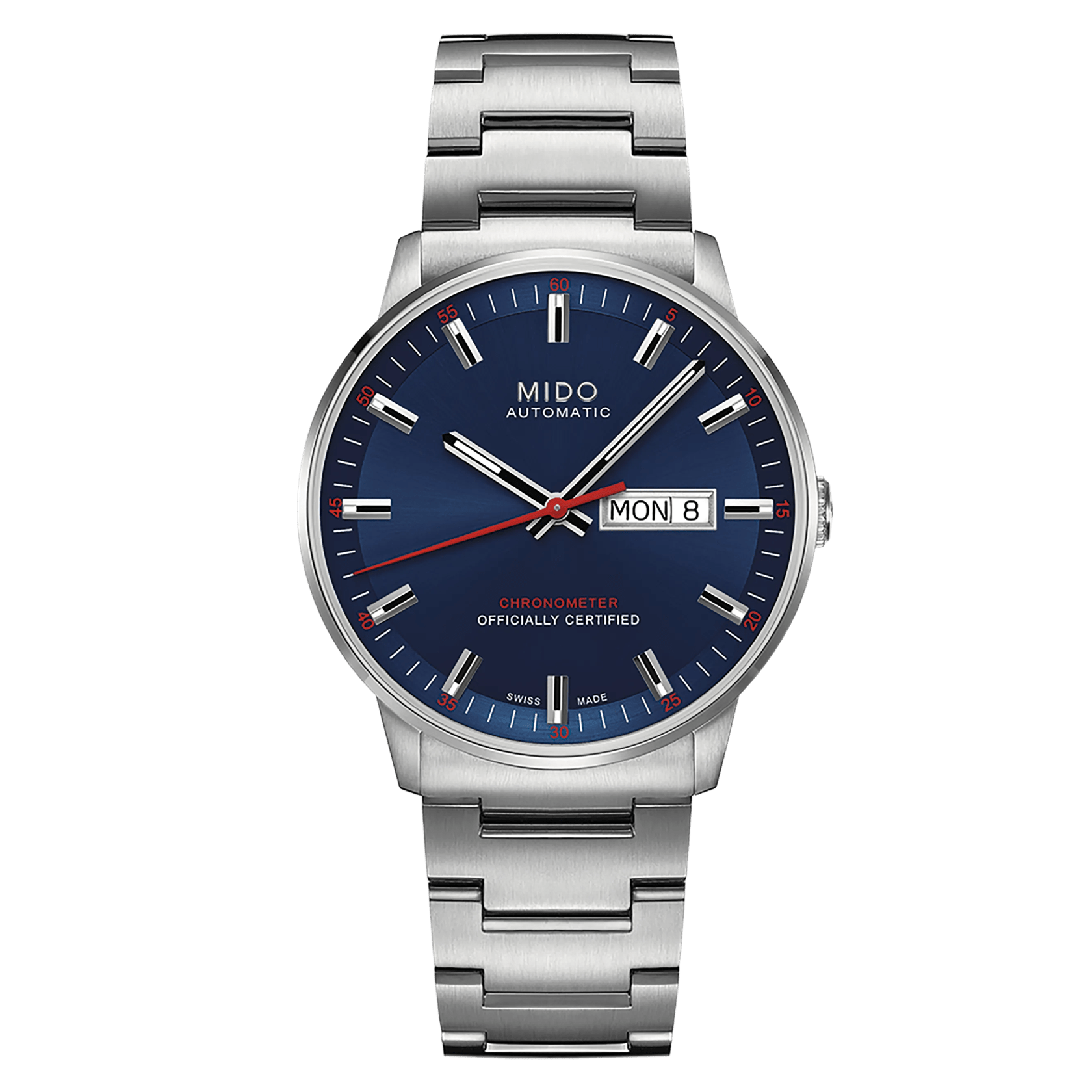 The Mido Commander Chronometer 40mm is a refined men’s timepiece combining timeless design with certified Swiss precision. Crafted in stainless steel, it features a striking blue dial with applied indexes for a bold yet elegant look. Powered by a Mido Automatic Chronometer ETA movement (Caliber 7709) with silicon balance spring, it delivers exceptional accuracy and an impressive power reserve of up to 80 hours. Officially certified by COSC, this chronometer ensures outstanding performance. A stainless steel bracelet and sapphire crystal complete this sophisticated watch.