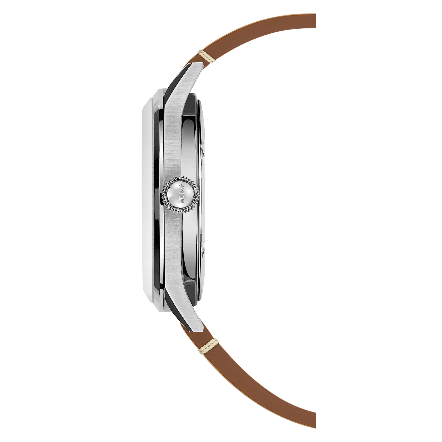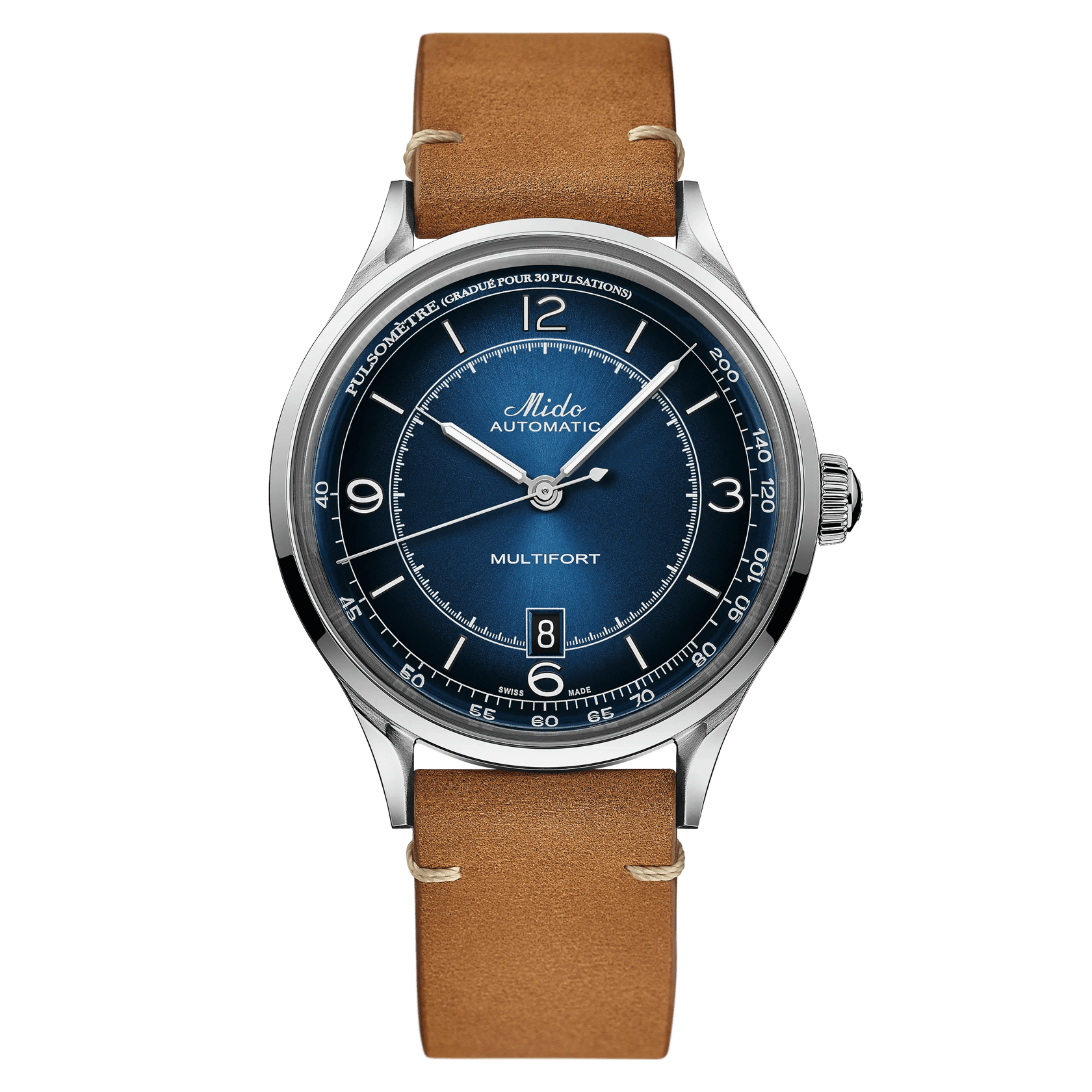 The Mido Multifort Patrimony 40mm is a refined Swiss-made watch for men, featuring a stainless steel case and a beige leather strap with a pin buckle. The watch is powered by the Mido Automatic ETA movement (Caliber 6583) with a power reserve of up to 80 hours. It features a blue dial with applied indexes and Arabic numerals, date and day functions, and a see-through case back. Water-resistant to 50m, it is ideal for everyday wear with a classic style.