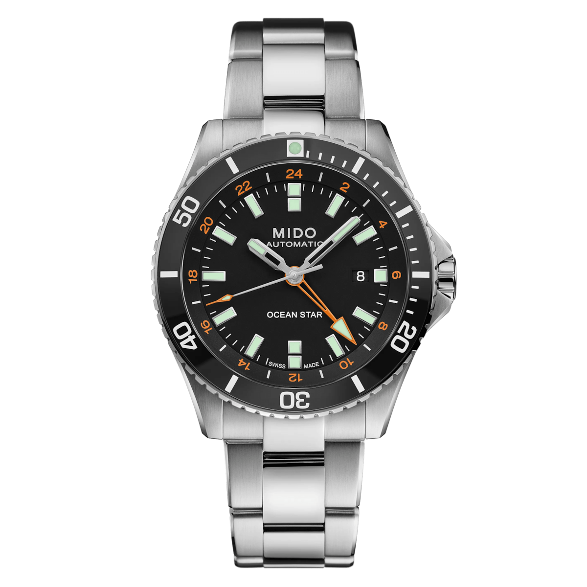 The Mido Ocean Star GMT 44mm is a powerful and travel-ready diving watch combining Swiss precision with bold design. Crafted in stainless steel with a ceramic bezel, it features a sleek black dial with applied indexes for maximum clarity in all conditions. Powered by a Mido Automatic ETA movement (Caliber 10847) with up to 80 hours of power reserve, it offers a practical GMT function for tracking a second time zone alongside a date display. With 200m water resistance and a screw-down crown, this Swiss-made timepiece is built for both deep-sea performance and global travel.