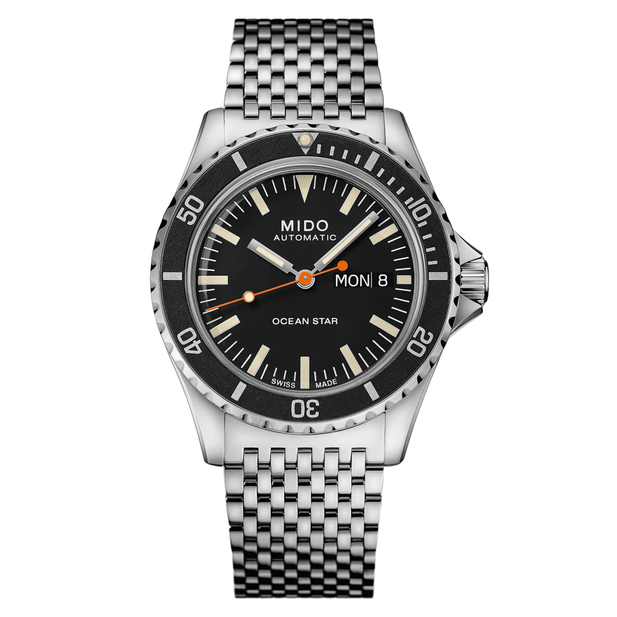 The Mido Ocean Star Tribute 40.5mm pays homage to the brand’s iconic diving heritage while delivering modern Swiss performance. Crafted in stainless steel, it features a bold black dial with applied indexes for excellent legibility. Powered by a Mido Automatic ETA movement (Caliber 6583) with up to 80 hours of power reserve, it offers both day and date functions for everyday practicality. With 200m water resistance and a screw-down crown, this Swiss-made timepiece combines vintage-inspired design with reliable dive-watch capability.
