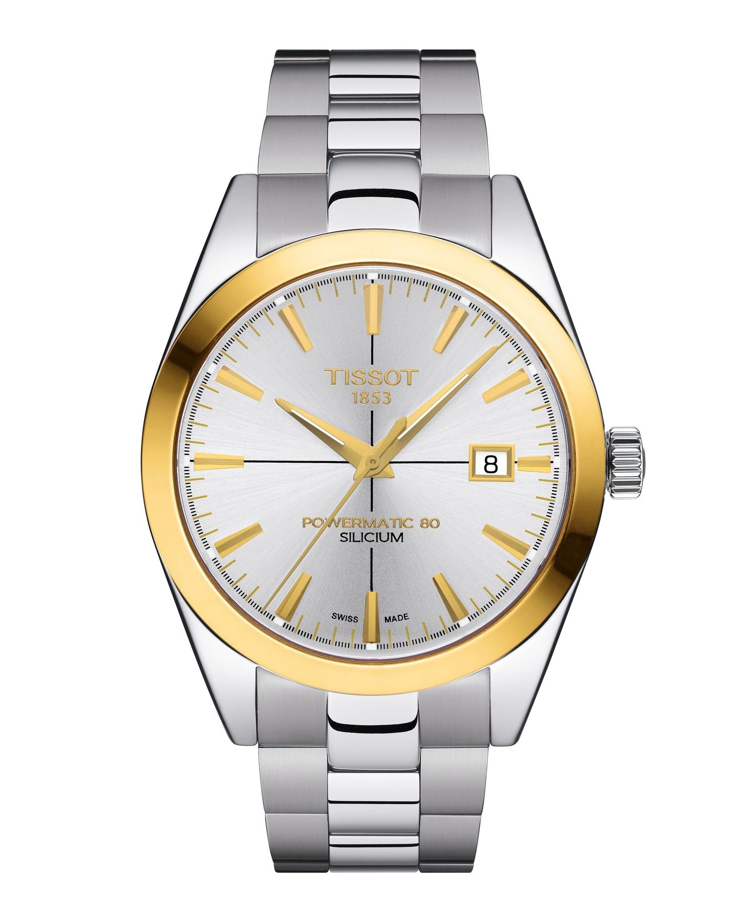 The TISSOT Gentleman Gold Bezel 40mm combines classic elegance with modern design. This men's Swiss automatic watch features a 316L stainless steel case with 18K yellow gold bezel, silver dial, and grey stainless steel bracelet. It includes a see-through caseback, domed scratch-resistant sapphire crystal, patented silicon balance spring, and 80-hour power reserve. Water-resistant up to 50 meters, it is perfect for everyday wear with refined style.