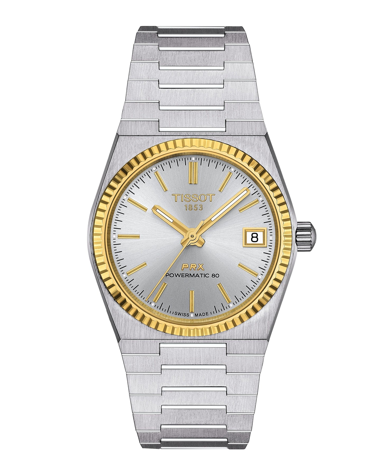 The TISSOT PRX Gold 35mm combines modern style with Swiss precision. This unisex watch features a 316L stainless steel case with 18K yellow gold bezel, silver dial, and grey stainless steel bracelet. Powered by the Swiss automatic Powermatic 80.111 movement with up to 80 hours of power reserve, it’s both elegant and reliable. Scratch-resistant sapphire crystal, see-through caseback, and butterfly clasp with quick-release bracelet ensure comfort, durability, and luxury for everyday wear.