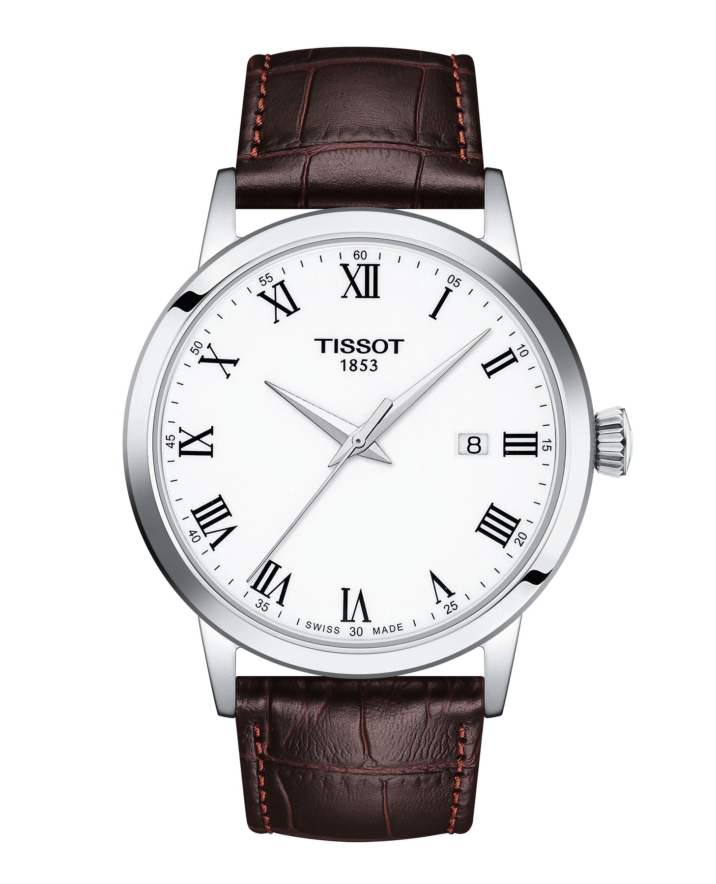 The TISSOT Classic Dream 42mm offers timeless elegance for men with a 316L stainless steel case, white Roman dial, brown leather strap, and Swiss quartz movement. Water-resistant up to 50m, it features a scratch-resistant sapphire crystal, interchangeable quick-release strap, and battery end-of-life indicator, combining style and practicality for daily wear.