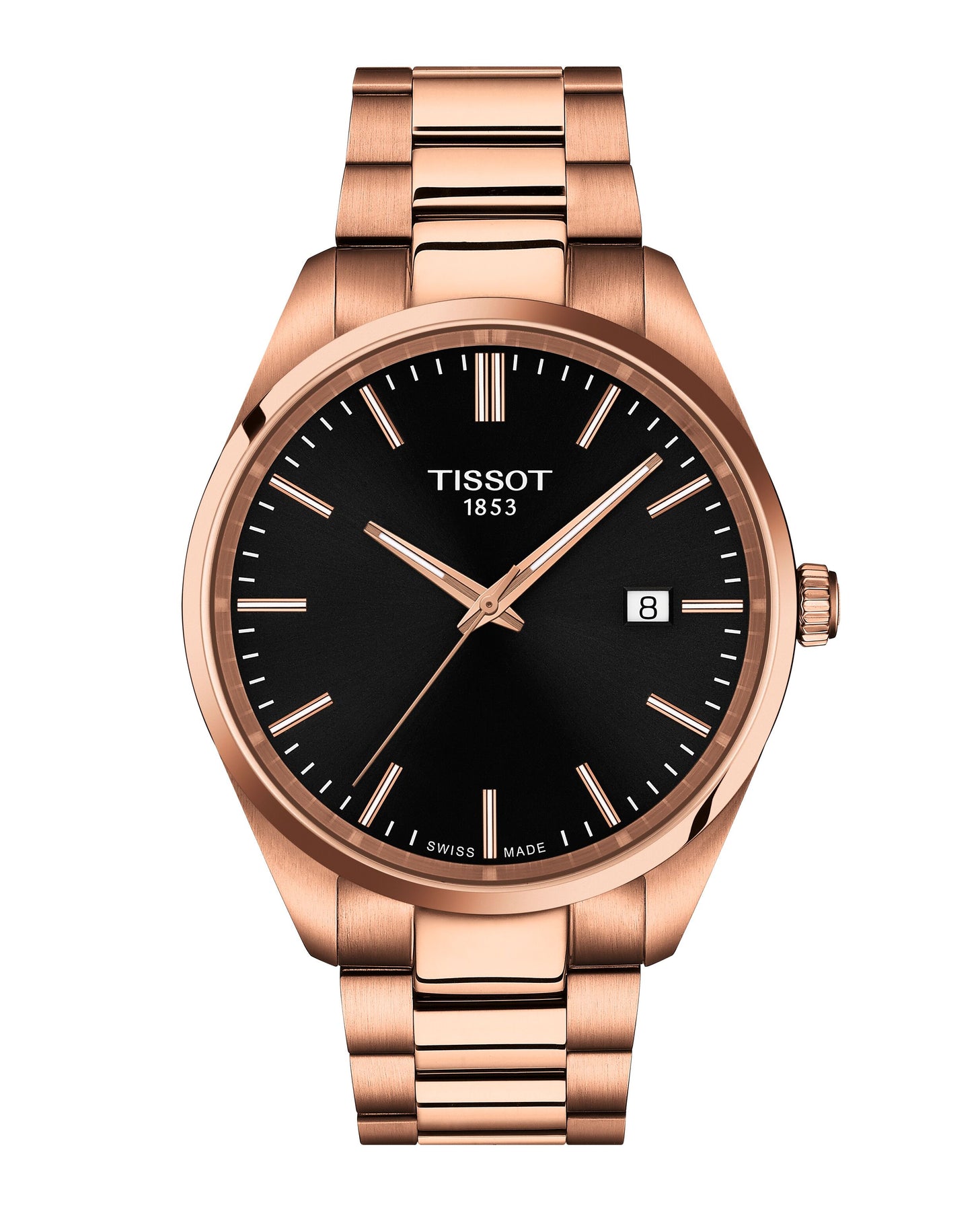 The TISSOT PR 100 40mm combines classic style with modern elegance. Designed for men, it features a 316L stainless steel case with rose gold PVD coating, a black dial with indexes, and a matching rose gold stainless steel bracelet. Powered by Swiss quartz (ETA F06.115) with battery end-of-life indicator, it offers 100m water resistance and a scratch-resistant sapphire crystal. Perfect for daily wear or special occasions.