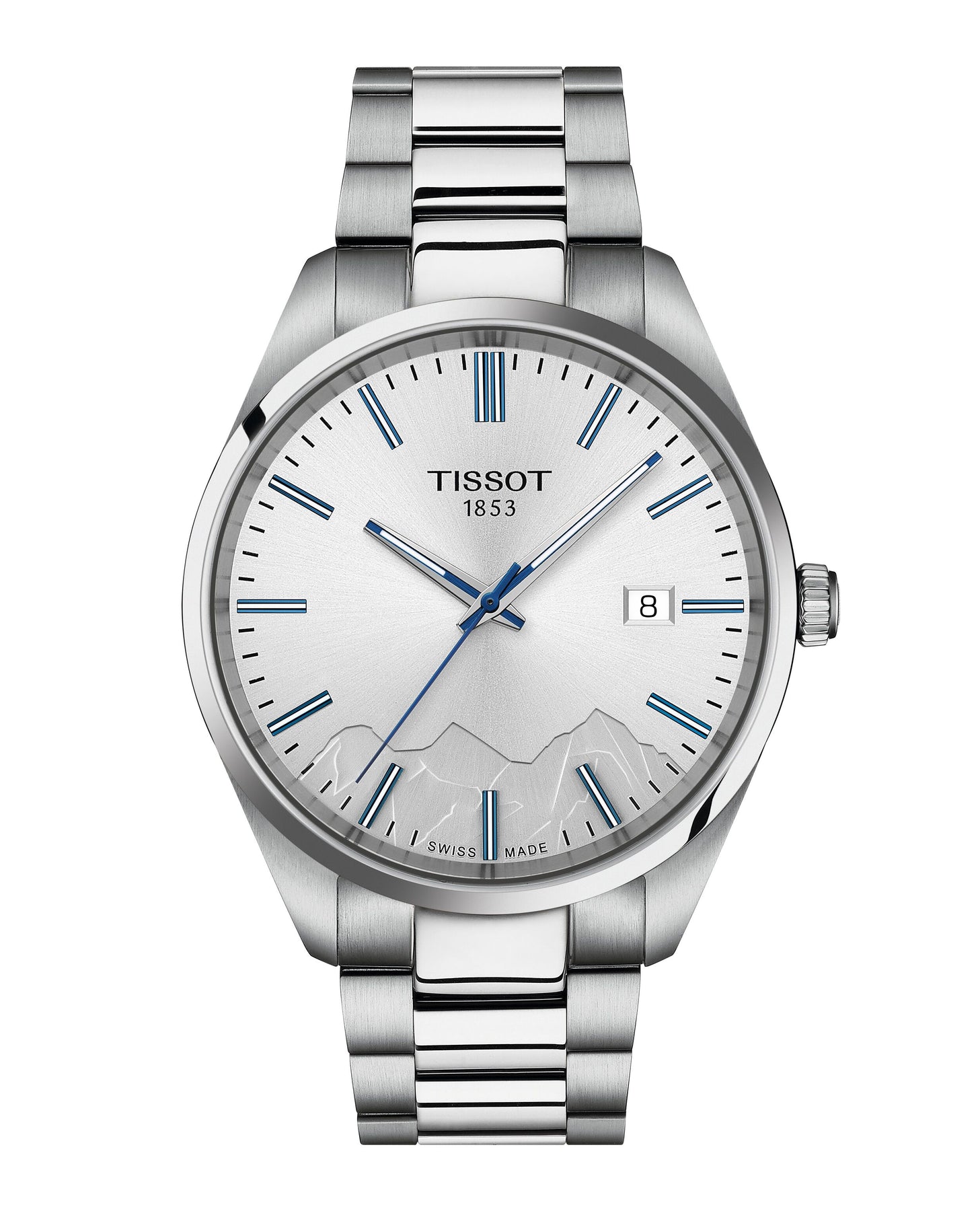 The TISSOT PR 100 Jungfraubahn 40mm is a sophisticated Swiss quartz watch for men, featuring a 316L stainless steel case, silver dial, and grey stainless steel bracelet. With a water resistance of 100 meters, scratch-resistant sapphire crystal, engraved caseback, and battery end-of-life indicator, it combines timeless elegance with everyday reliability.