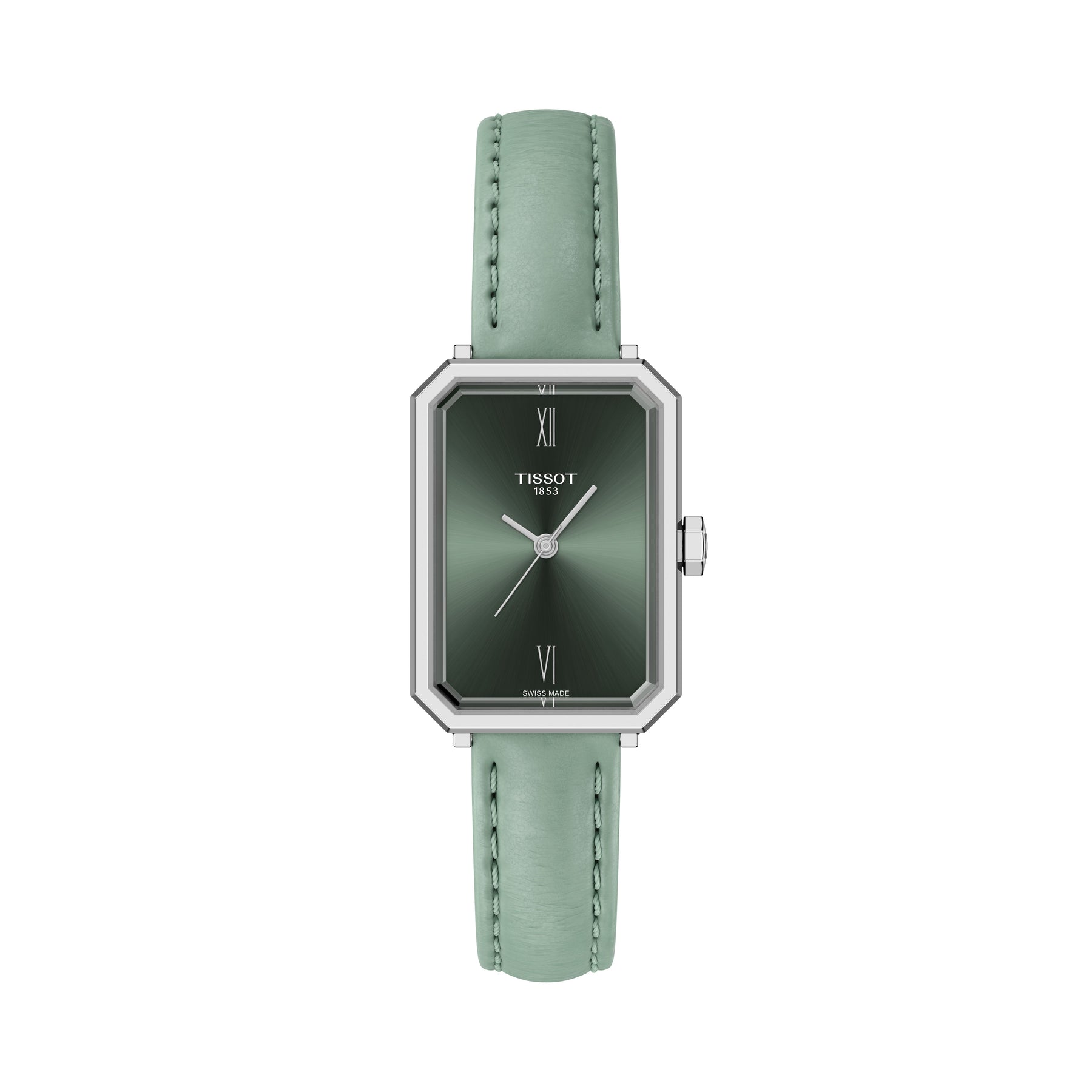 The TISSOT SRV 30mm draws inspiration from Art Deco design of the 1920s, featuring geometric shapes and a faceted rectangular sapphire glass. Its Swiss quartz movement ensures precision and includes an End-of-Life indicator. The embossed green leather strap evolves over time, adapting comfortably to the wrist. Elegant yet practical, this watch delivers style, comfort, and 5-bar water resistance for everyday wear.