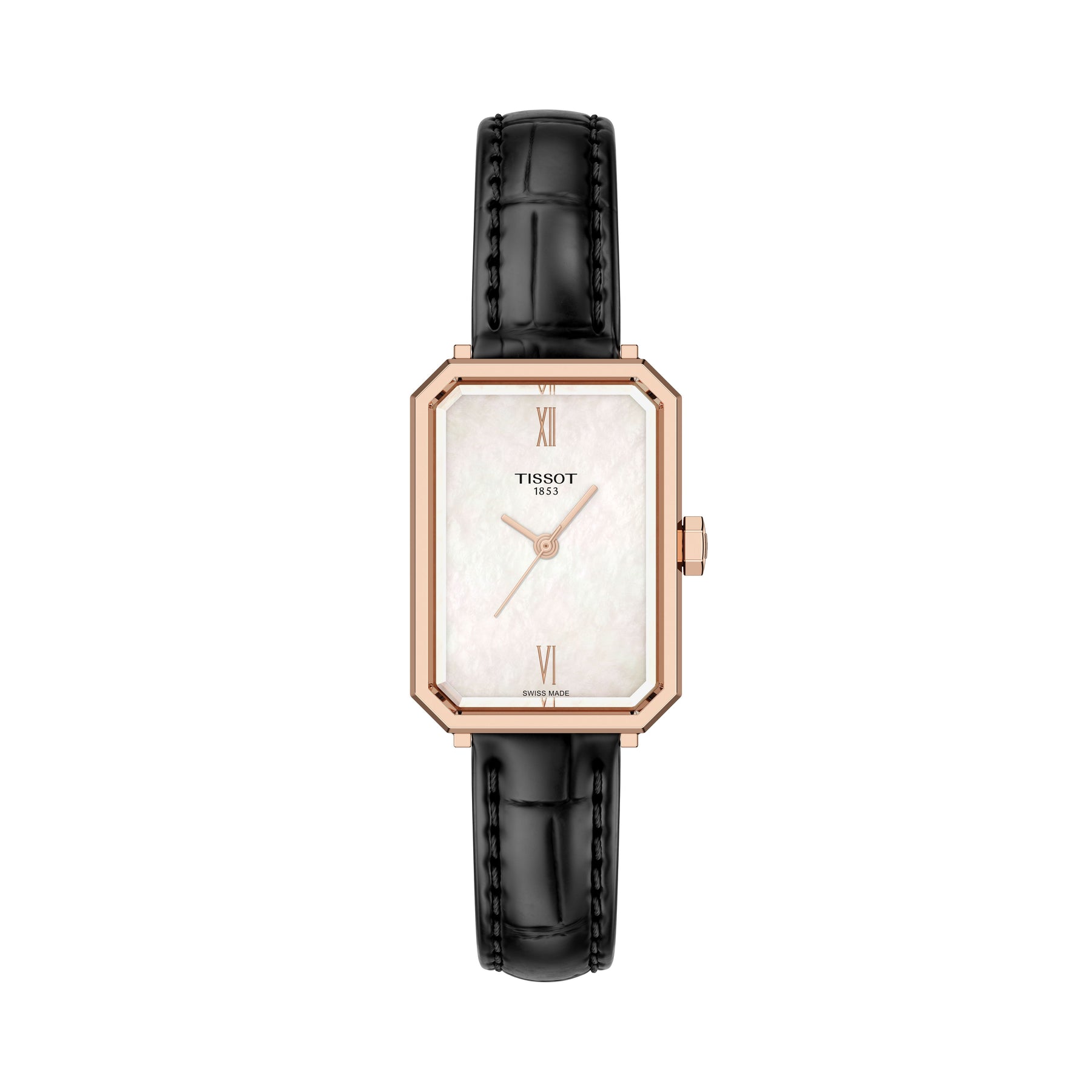 The TISSOT SRV 30mm blends Art Deco inspiration with modern elegance. Featuring a rectangular 316L stainless steel case with carnation gold PVD coating, this Swiss quartz watch has a white mother-of-pearl dial with Roman indexes and a black alligator-style leather strap that adapts over time for comfort. Scratch-resistant sapphire crystal, 5-bar water resistance, and interchangeable quick-release bracelet complete this stylish and practical design.
