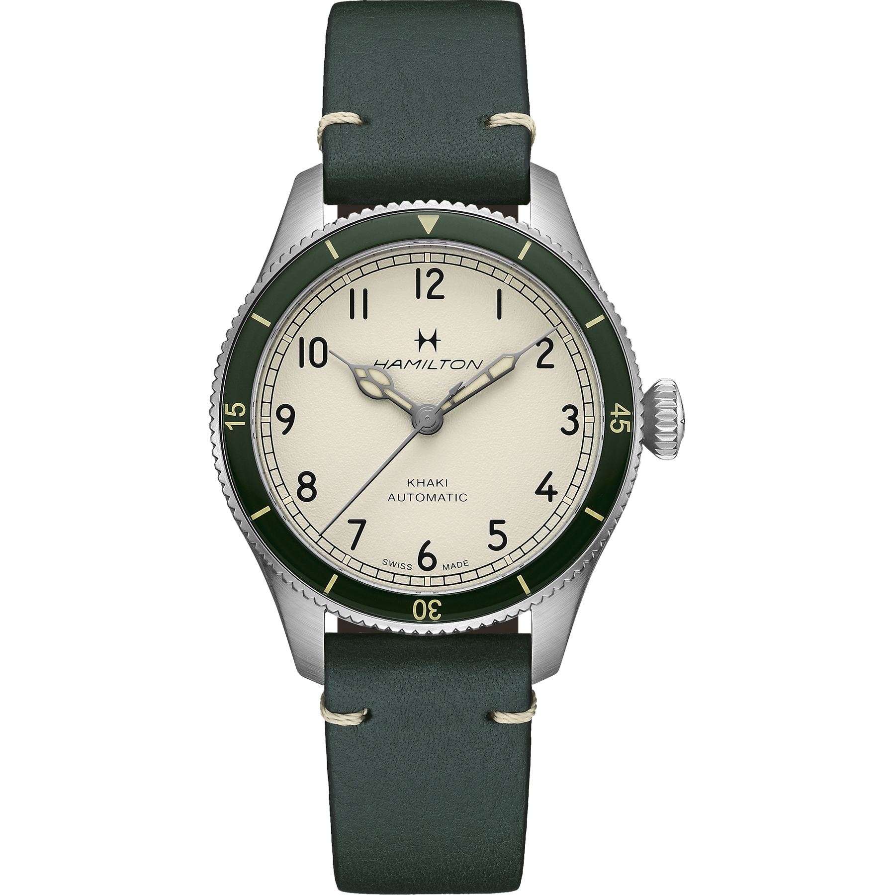The Hamilton Khaki Aviation Pilot Pioneer 38mm pays tribute to the brand’s rich aviation and military heritage. Showcasing distinctive retro charm, it features an eggshell-white dial paired with a moss green turning bezel and green leather strap. Powered by the H-10 automatic movement with an 80-hour power reserve and Nivachron™ balance spring, it delivers reliable Swiss precision. With a stainless steel case, sapphire crystal, and 100m water resistance, this timepiece blends vintage style with modern performance.