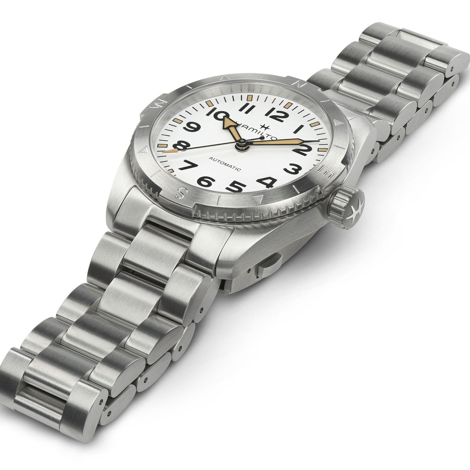 Gear up for the great outdoors with the Hamilton Khaki Field Expedition Auto 37mm, an all-terrain adventure watch with a compass-inspired design. Housed in a 37mm stainless steel case with a matching 3-link steel bracelet and folding clasp, it is equipped with a screw-down crown for protection. The white sandblasted dial ensures ultimate legibility, making this watch a reliable companion for your toughest adventures.
