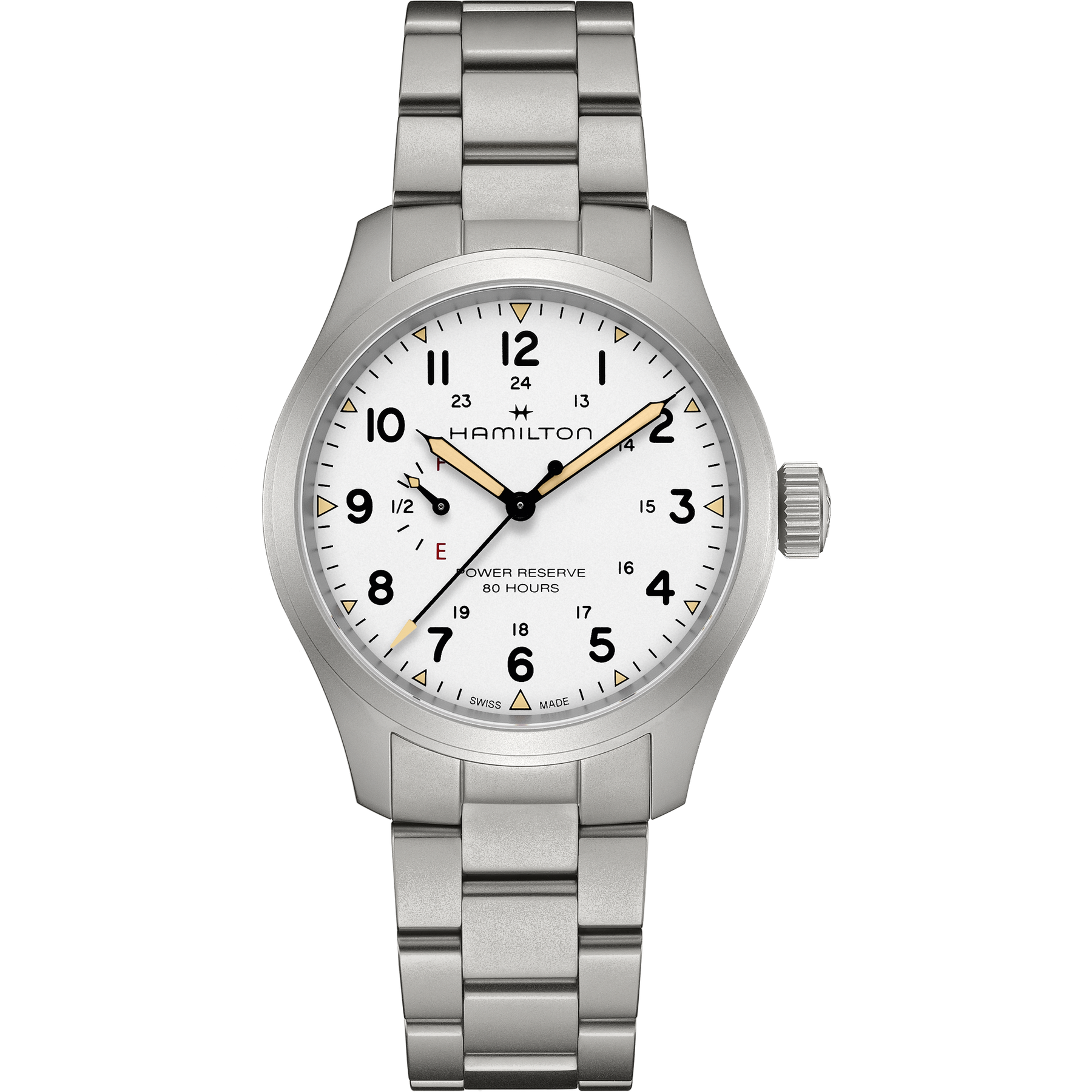 The Hamilton Khaki Field Mechanical Power Reserve 40mm stays true to the heritage-inspired design and functionality of the Khaki Field collection while introducing modern watchmaking innovation. Powered by the manual-winding H-23 movement, developed exclusively for Hamilton, this model features an 80-hour power reserve displayed directly on the dial. The white dial clearly indicates “F” for full and “E” for empty, highlighting its practical power reserve indicator. Finished with a stainless steel bracelet, this timepiece combines military-inspired aesthetics with contemporary precision.