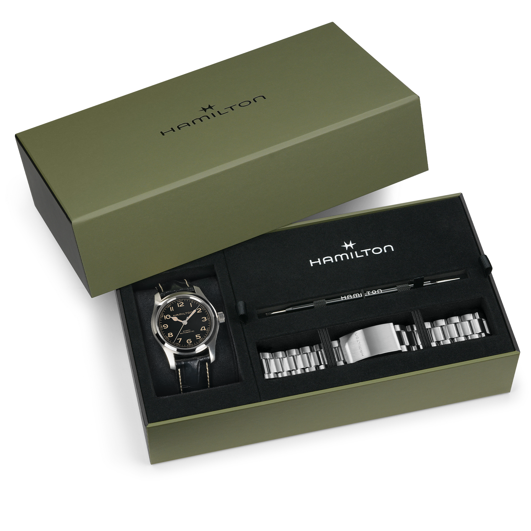 This special bundle set gives you more choices to wear the iconic Khaki Field Murph 42mm, complete with a sophisticated leather strap and a sleek stainless steel bracelet in one package. Built with Hamilton’s commitment to craftsmanship, durability, and attention to detail, the leather strap adds timeless appeal while the metal bracelet provides comfort and versatility, giving your timepiece a refined and elegant edge.
