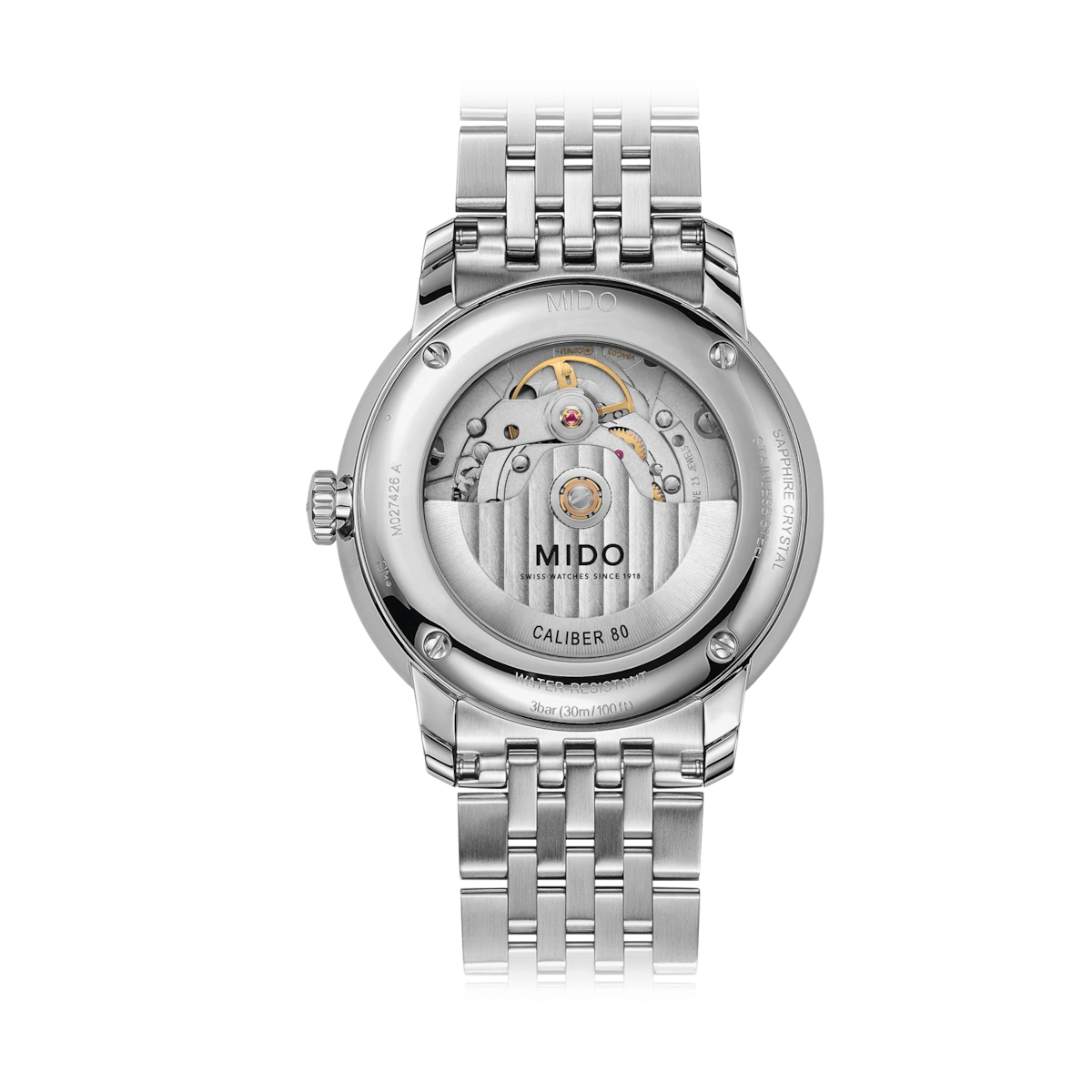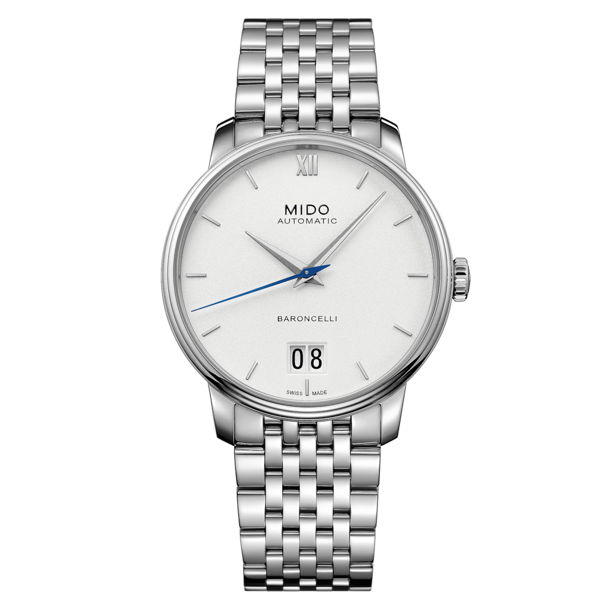 The Mido Baroncelli Big Date 40mm is a sophisticated men’s timepiece crafted in stainless steel. It features a white dial with a combination of indexes and Roman numerals, along with a big date function. Powered by the MIDO Automatic ETA Caliber 9399 movement with up to 80 hours of power reserve, it combines classic elegance with modern precision. The grey stainless steel bracelet and sapphire crystal with double-sided anti-reflection treatment complete this refined watch, which also has a see-through case back.