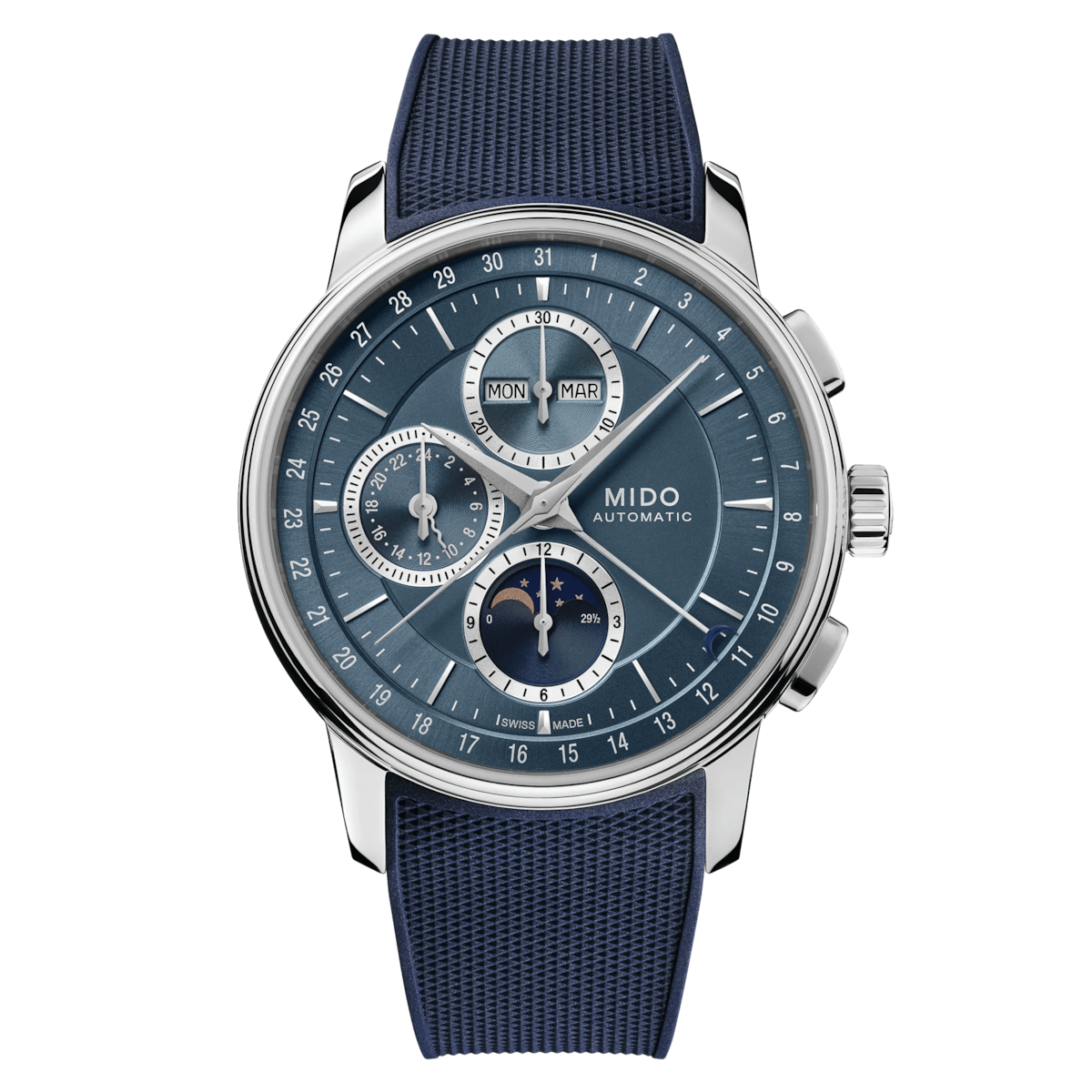 The Mido Baroncelli Chronograph Moonphase 42mm is a sophisticated men’s timepiece that combines elegant design with advanced watchmaking complications. Crafted in stainless steel with a round case, it features a striking blue dial with index markers. Powered by a MIDO Automatic ETA mechanical movement (Caliber 8780) with up to 60 hours of power reserve, it offers multiple functions including chronograph, moon phase, hand date, day, month, 24 hours, and small seconds. A blue rubber strap and sapphire crystal with double-sided anti-reflection treatment complete this refined and sporty timepiece.