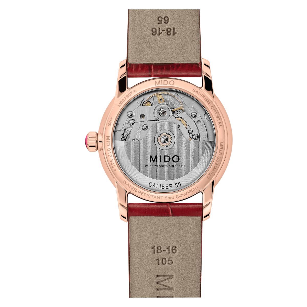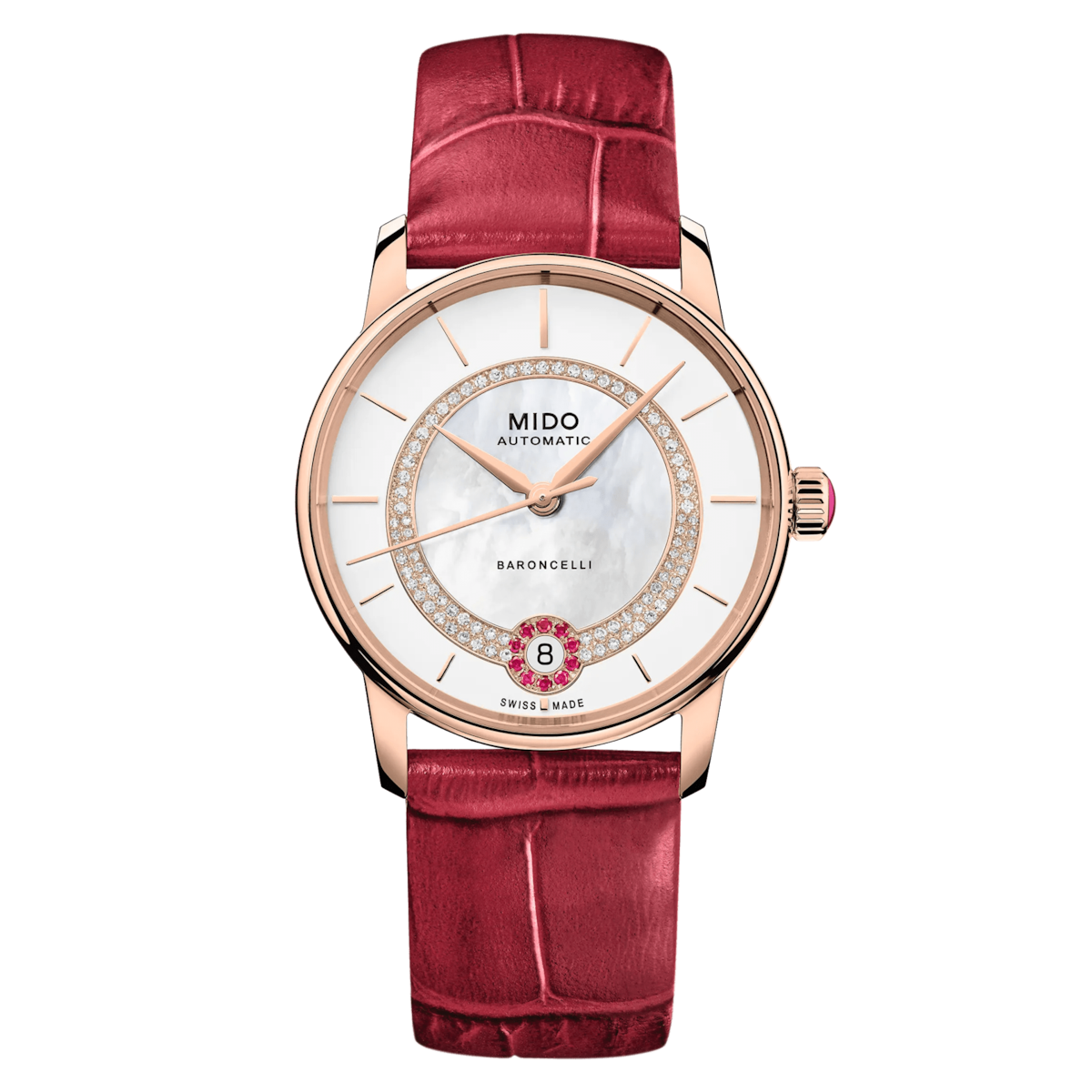 The Mido Baroncelli Lady Necklace 33mm is a sophisticated women’s watch featuring a white mother-of-pearl dial set with 83 diamonds. Its stainless steel case with rose gold PVD coating is complemented by a luxurious red leather strap with folding clasp. Powered by the MIDO Automatic ETA Caliber 6601 movement, it delivers up to 80 hours of power reserve. A sapphire crystal with double-sided anti-reflection treatment and a see-through case back complete this elegant timepiece.