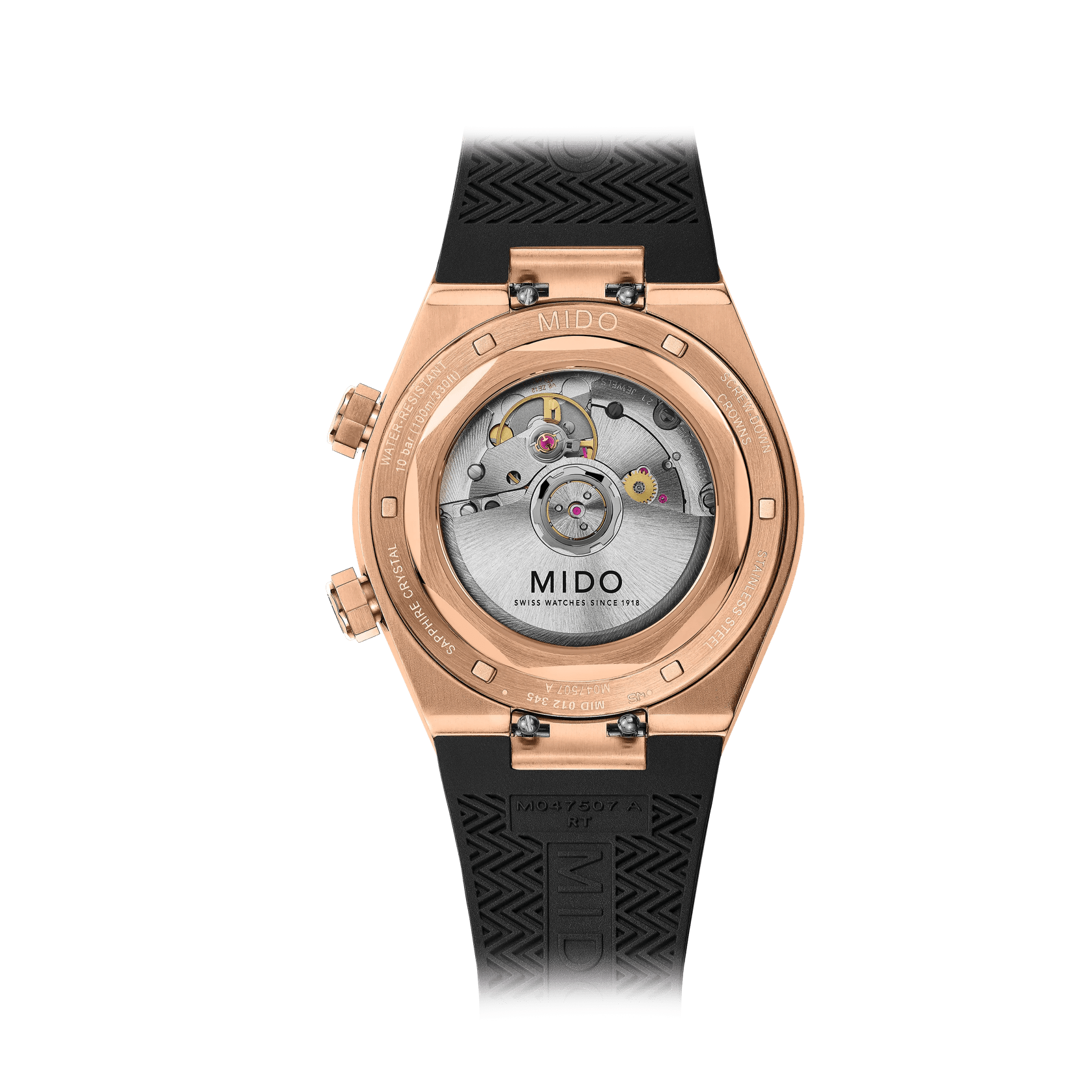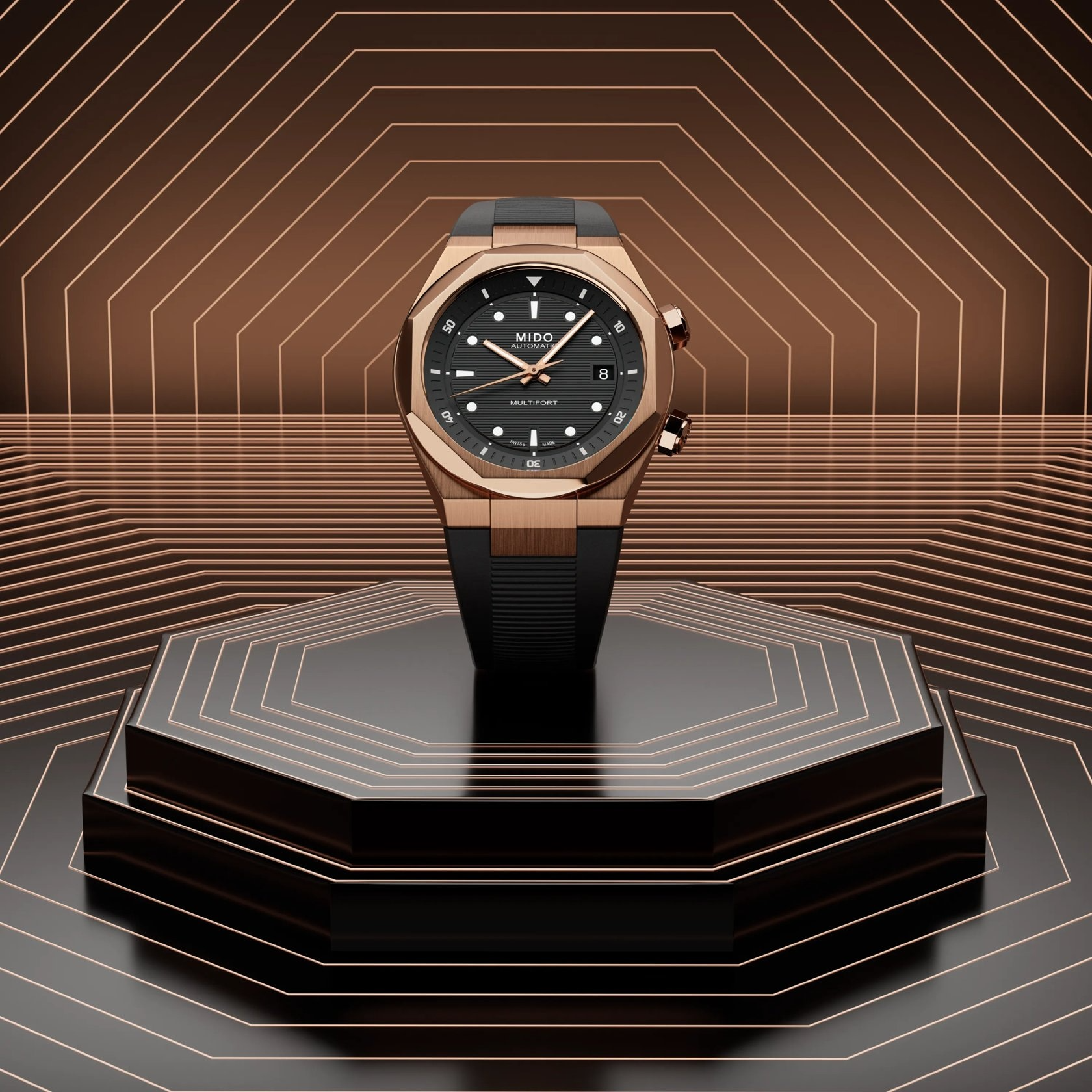 The Mido Multifort 8 Two Crowns 38.4x40mm is a sophisticated men’s timepiece blending sporty design with Swiss precision. Crafted in stainless steel with rose gold colour PVD coating, it features a sleek black dial with applied indexes for a modern and elegant look. Powered by a Mido Automatic ETA movement (Caliber 7710) with up to 72 hours of power reserve, it delivers reliable performance and a practical date function. The watch includes a screw-down crown and a see-through case back, while the sapphire crystal with double-sided anti-reflection treatment ensures durability. Finished with a black rubber strap and 100-meter water resistance, this watch combines style and functionality for everyday wear.