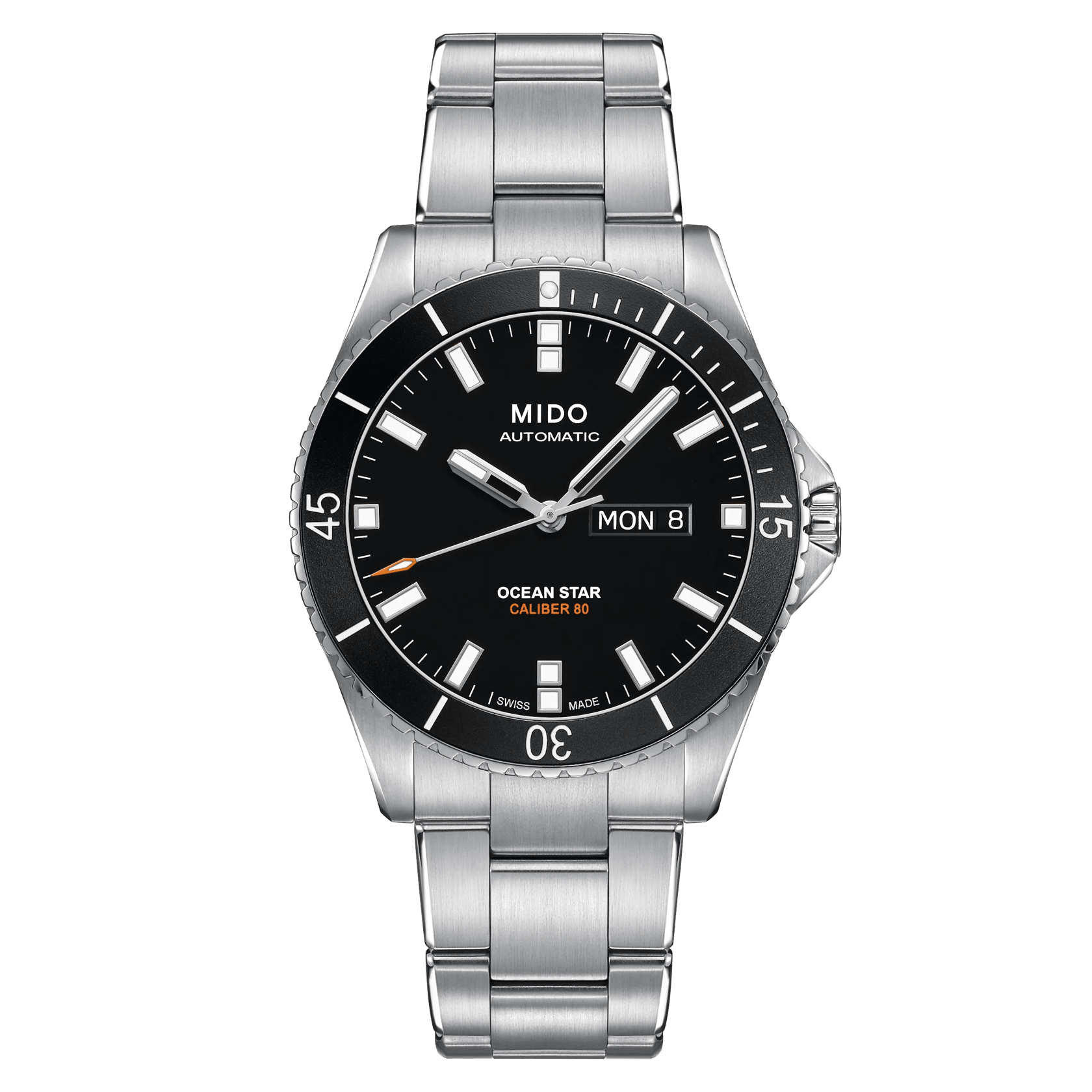 The Mido Ocean Star 200 42.5mm is a robust dive watch for men, featuring a stainless steel case and grey stainless steel bracelet. It has a black dial with applied indexes and is powered by a Mido Automatic ETA movement (Caliber 6583) with up to 80 hours of power reserve. Functions include date and day display. Water-resistant to 200m with a screw-down crown, it comes with a folding clasp with diving extension.