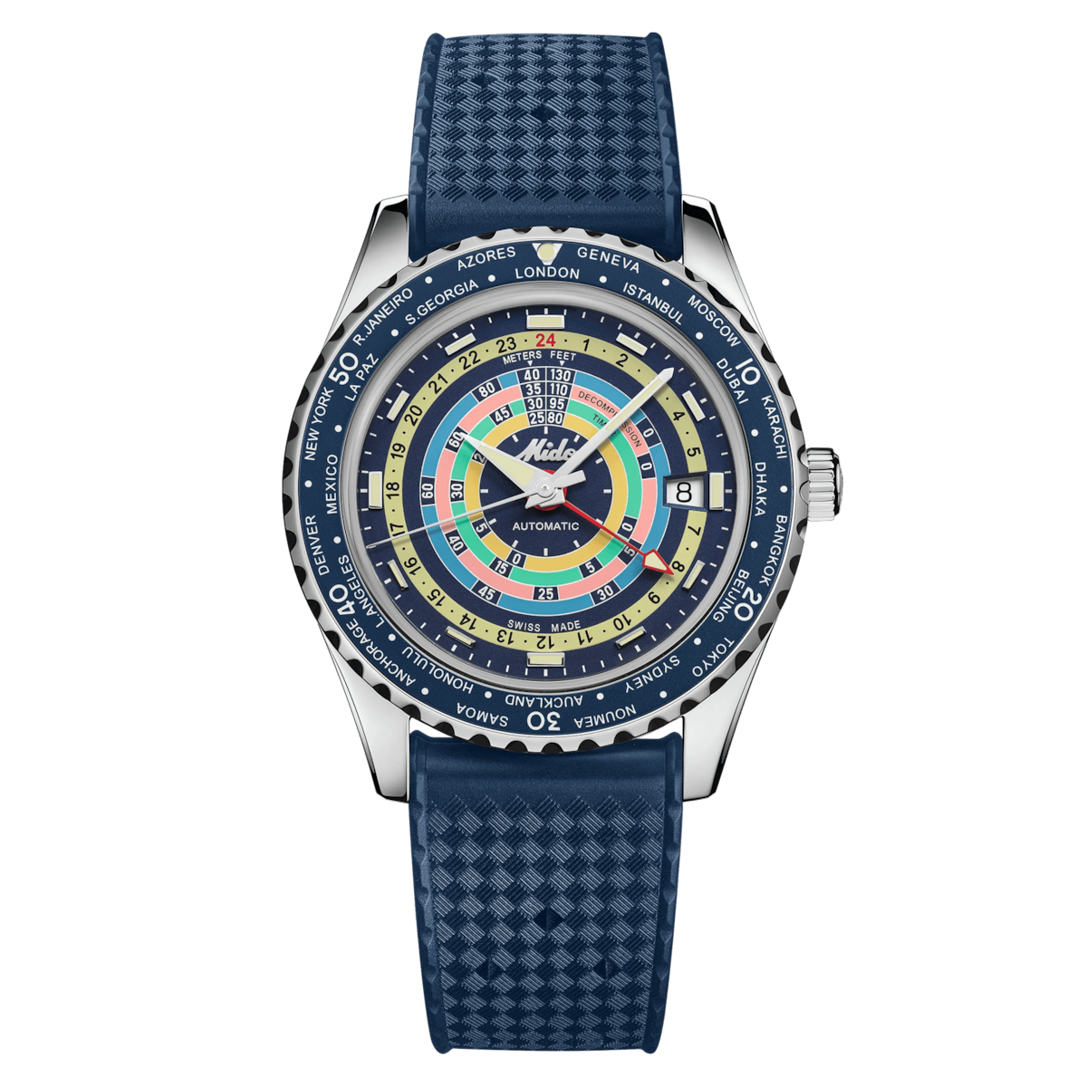 The Mido Ocean Star Decompression Worldtimer in striking blue is designed for divers and travelers who demand precision and style. Its 40.5 mm stainless steel case houses a blue dial with indexes and Arabic numerals, while a durable blue rubber strap ensures comfort during aquatic adventures. The watch is powered by a Mido Automatic ETA movement (Caliber 10847) with an 80-hour power reserve, featuring date and GMT functions. With a screw-down crown and 200m water resistance, it’s built to perform under pressure.
