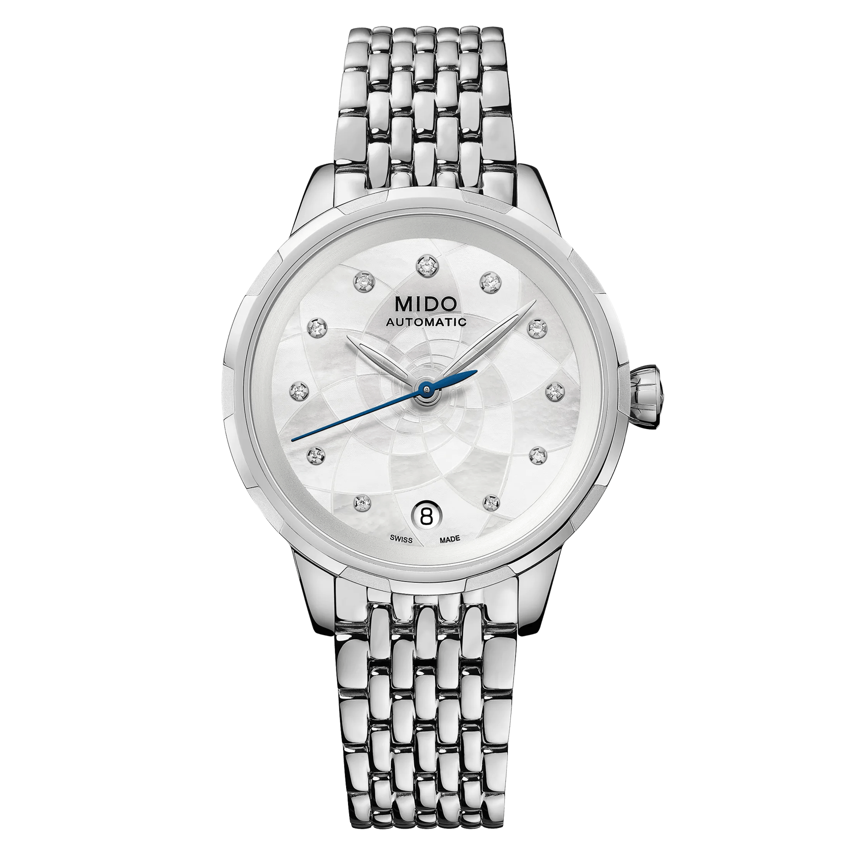 The Mido Rainflower 34mm is an elegant ladies’ timepiece inspired by nature’s delicate beauty. Crafted in stainless steel with a 34mm round case, it features a luminous white mother-of-pearl dial adorned with 11 sparkling diamond indexes. Powered by a MIDO Automatic ETA mechanical movement with up to 80 hours of power reserve, it offers both precision and refinement. A sapphire crystal with double-sided anti-reflection treatment and a stainless steel bracelet complete this sophisticated everyday watch.