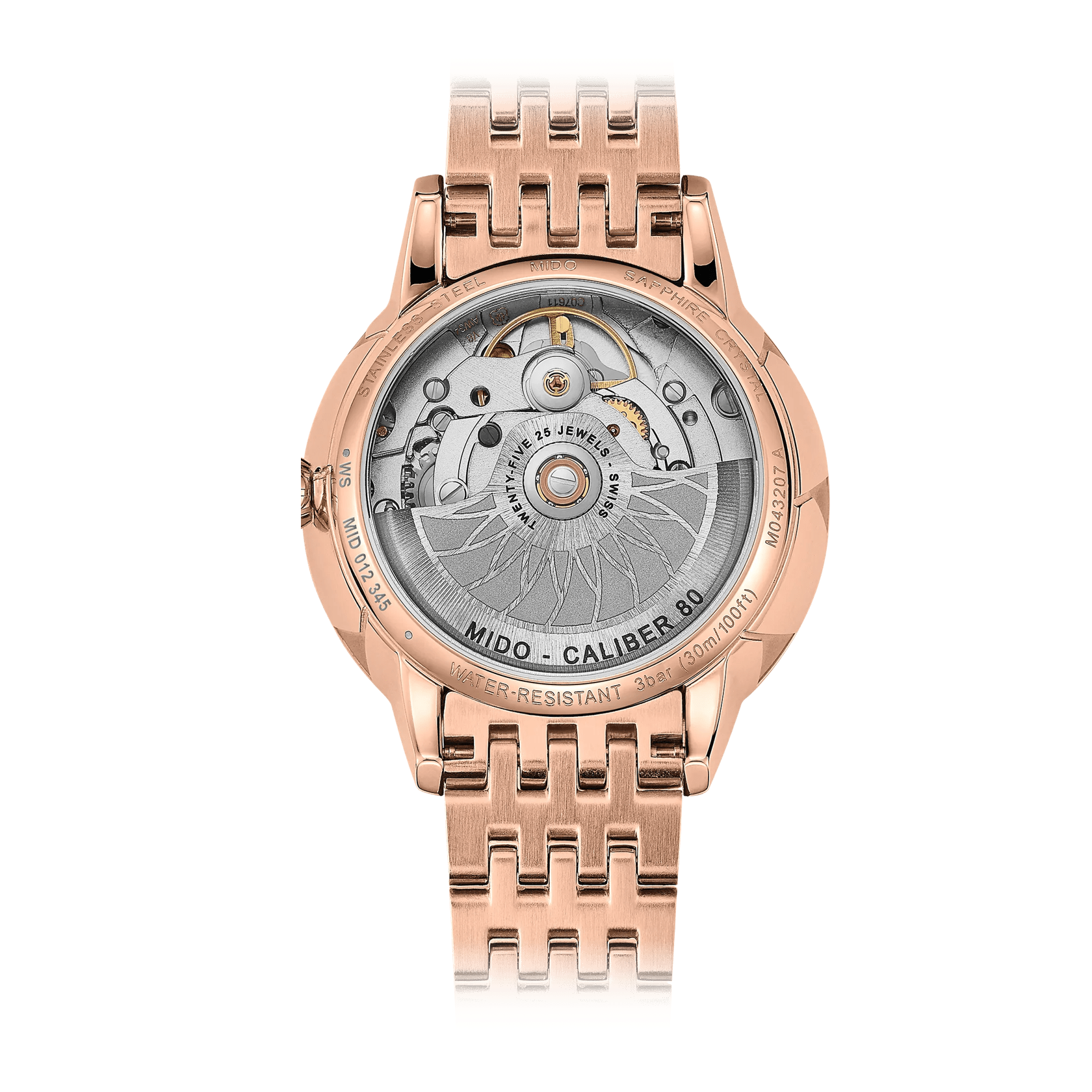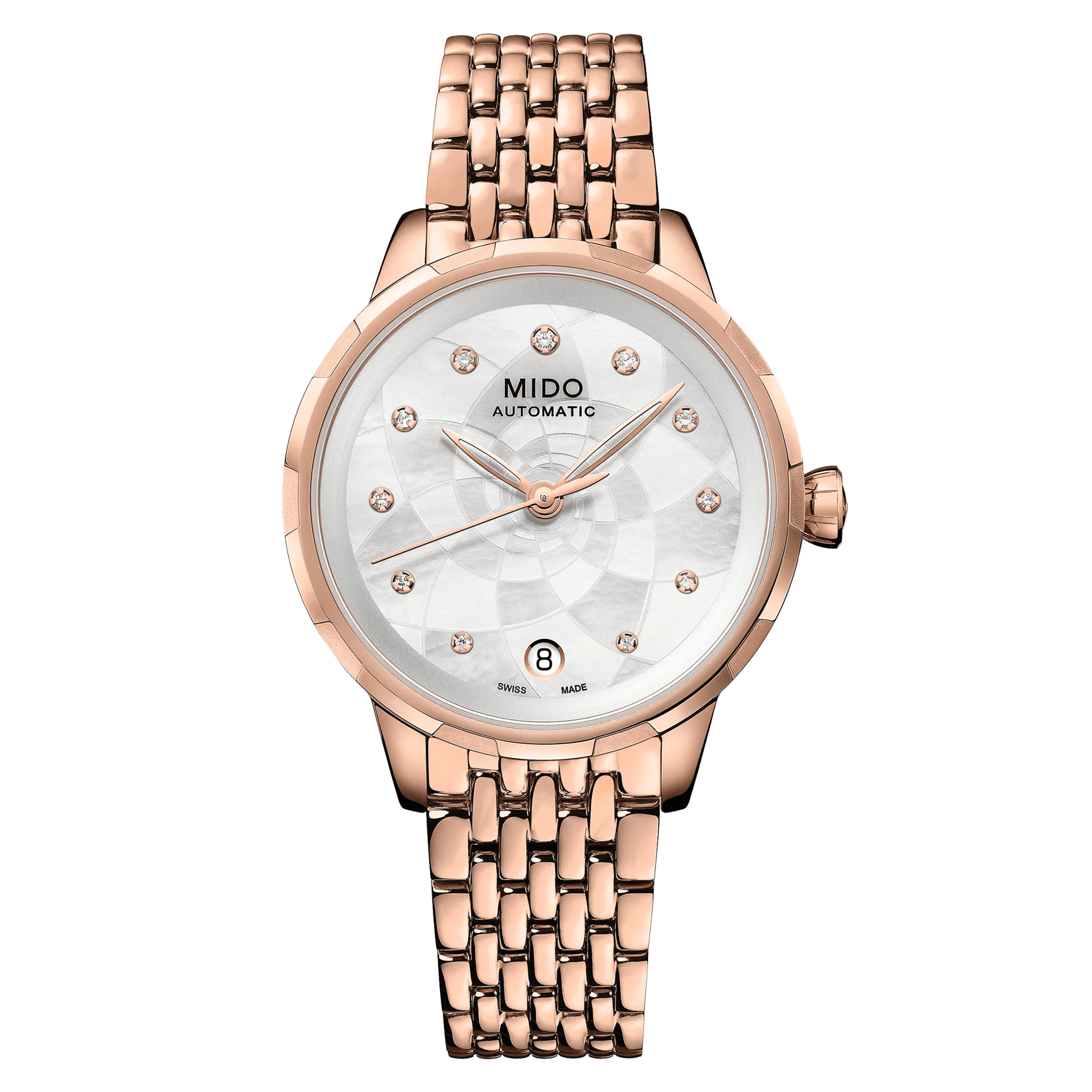 The Mido Rainflower 34mm is an elegant Swiss-made ladies’ timepiece inspired by the beauty of nature. Crafted in stainless steel with rose gold colour PVD coating, it features a white mother-of-pearl dial set with 11 sparkling gemstones. Powered by an automatic mechanical movement with up to 80 hours of power reserve, it offers refined performance and everyday sophistication. A sapphire crystal with double-sided anti-reflection treatment and 30m water resistance complete this graceful design.