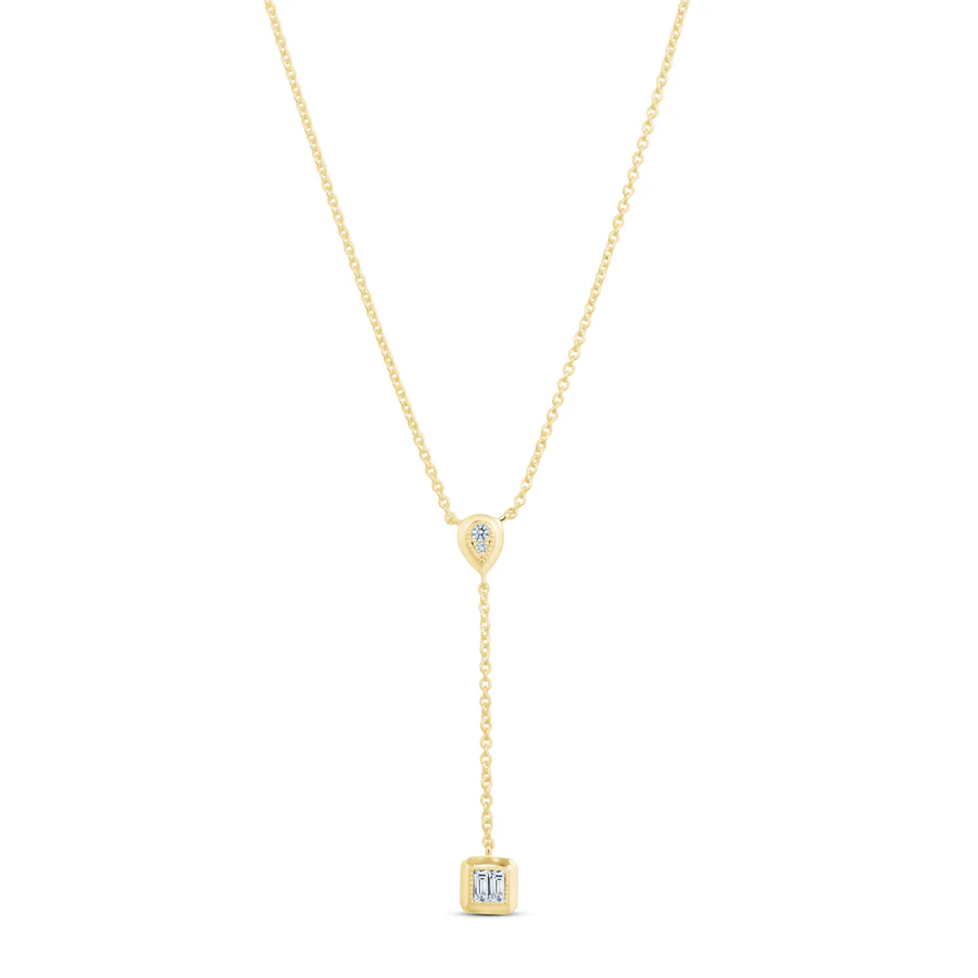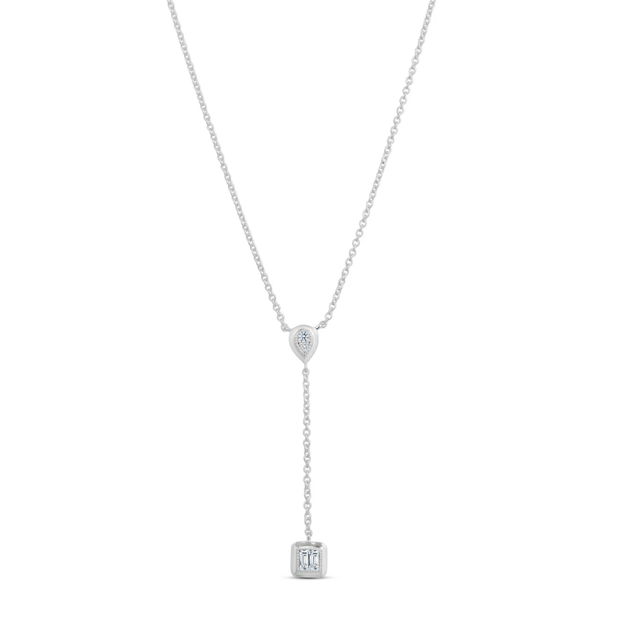 Faites une déclaration sophistiquée avec le collier lariat Miss Mimi Pear and Emerald Bezel. Fabriqué en Italie en argent sterling rhodié, cet élégant lariat présente des oxydes de zirconium de haute qualité dans des sertissages clos poire et émeraude, créant une pièce moderne et polyvalente parfaite pour être superposée ou portée seule.