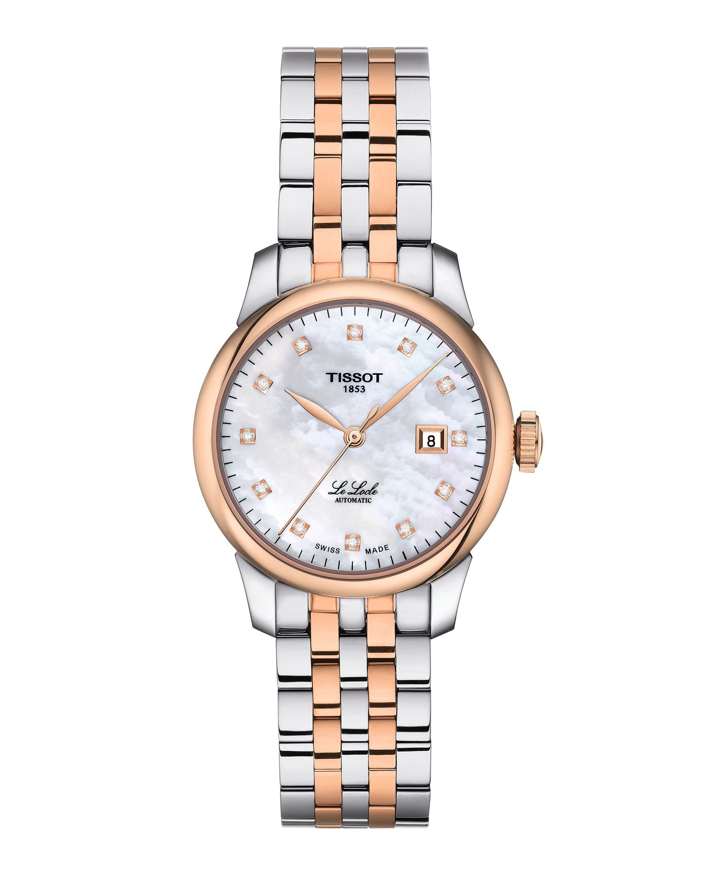 The TISSOT Le Locle 29mm combines classic elegance with Swiss craftsmanship. Designed for women, it features a 316L stainless steel case with rose gold PVD coating, white mother-of-pearl dial with 12 diamonds, and a two-tone stainless steel bracelet. With a see-through caseback, scratch-resistant sapphire crystal, automatic movement with Nivachron balance spring, and 48-hour power reserve, it offers both luxury and precision.