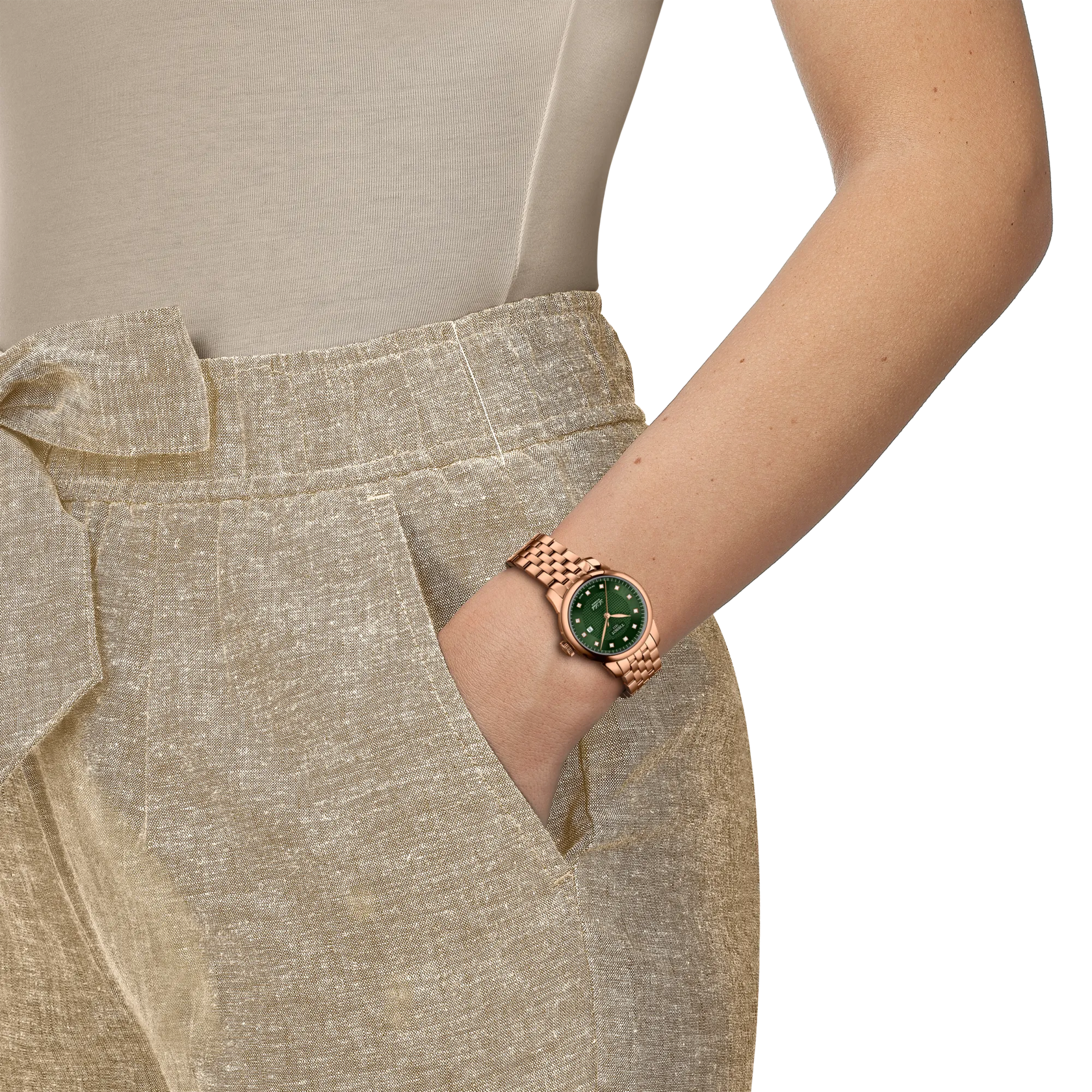 The TISSOT Le Locle 29mm is a refined Swiss automatic timepiece inspired by classic elegance. Designed for women, it features a 316L stainless steel case with rose gold PVD coating, a rich green dial set with 12 diamond indexes, and a matching rose gold stainless steel bracelet. Powered by the Powermatic 48.111 movement with up to 48 hours of power reserve and a patented Nivachron balance spring, this watch blends timeless sophistication with modern precision.