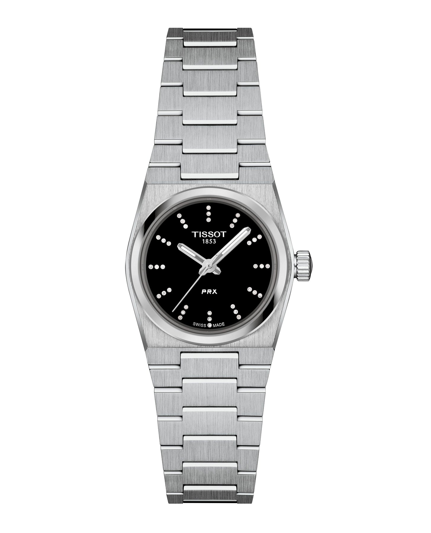 The TISSOT PRX 25mm is a refined and elegant women’s timepiece inspired by the iconic 1978 design. Featuring a 316L stainless steel tonneau-shaped case, black dial set with 36 diamonds, and a stainless steel bracelet, it delivers timeless sophistication. Powered by a Swiss quartz movement with EOL indicator and protected by scratch-resistant sapphire crystal, it blends precision with everyday luxury.